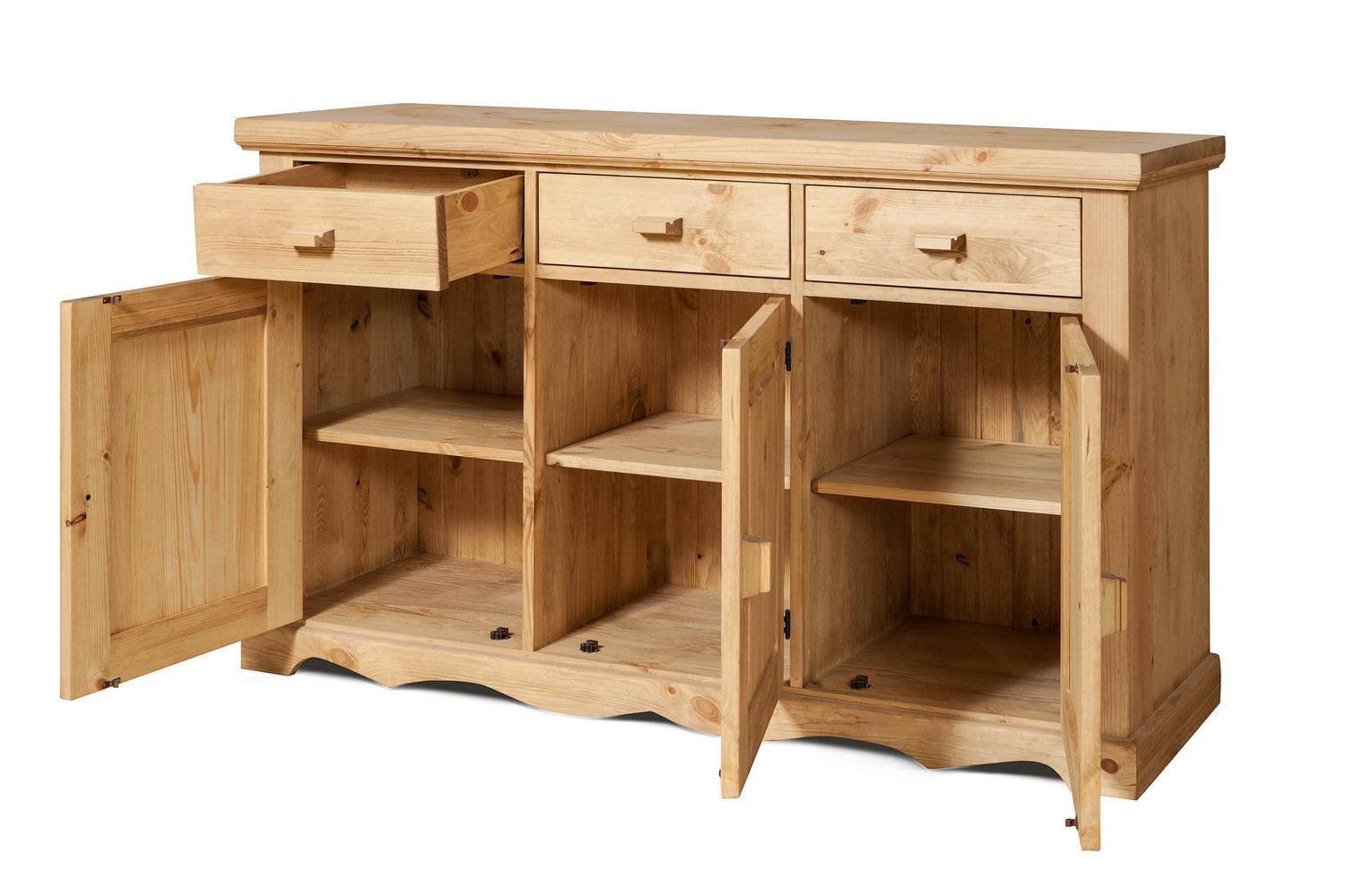 Корпус, ящики, полки и дверцы изготовлены из массива сосны.