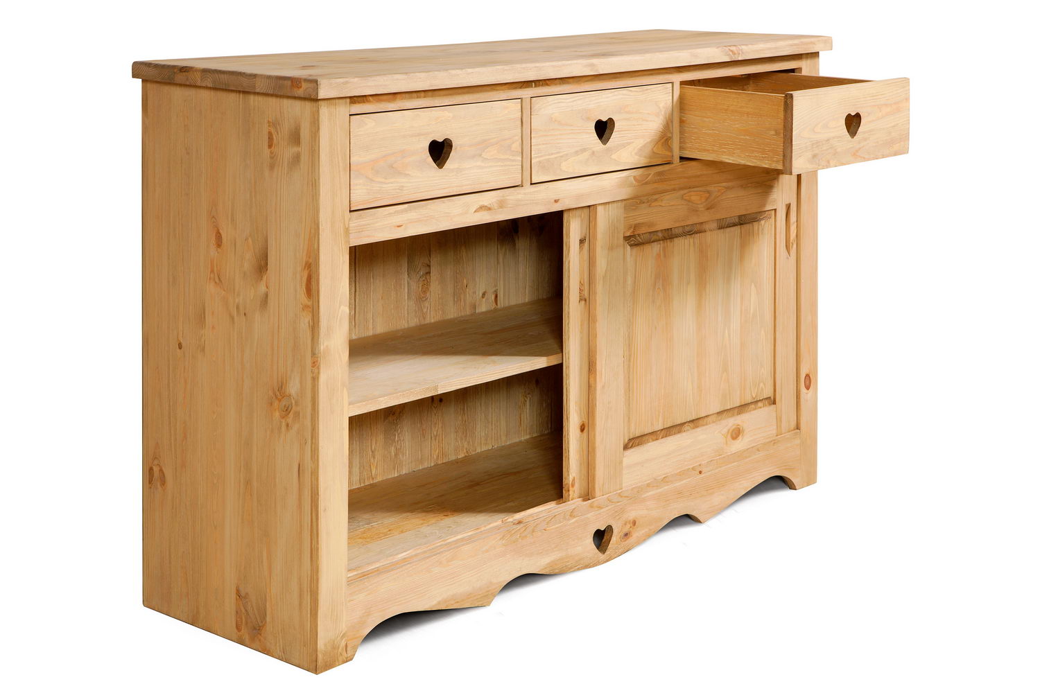 Корпус, ящики, полка и дверцы изготовлены из массива сосны.