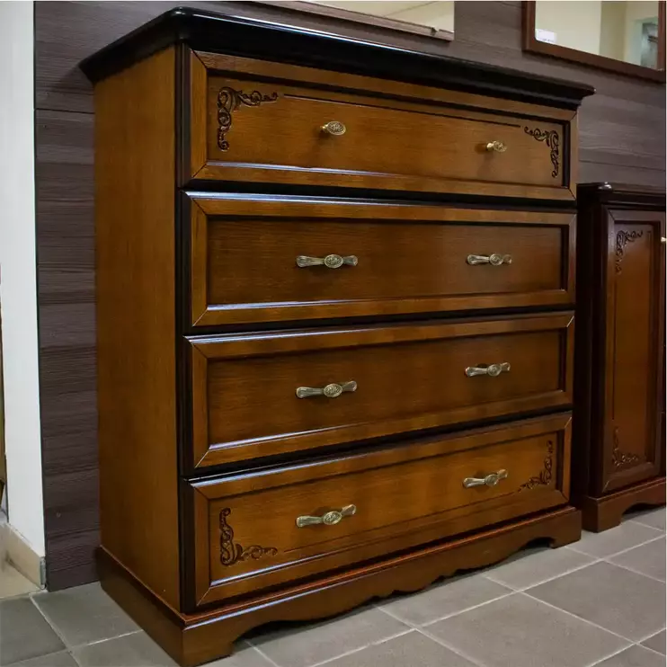 Шкафы, комоды, кровати, прикроватные тумбы, письменные столы и зеркала белорусского производства. Это мебель для гостиных, спален, библиотек и прихожих. Изготавливается из МДФ с облицовкой шпоном дуба, окрашивается в два цвета – махагон и альпийский дуб.