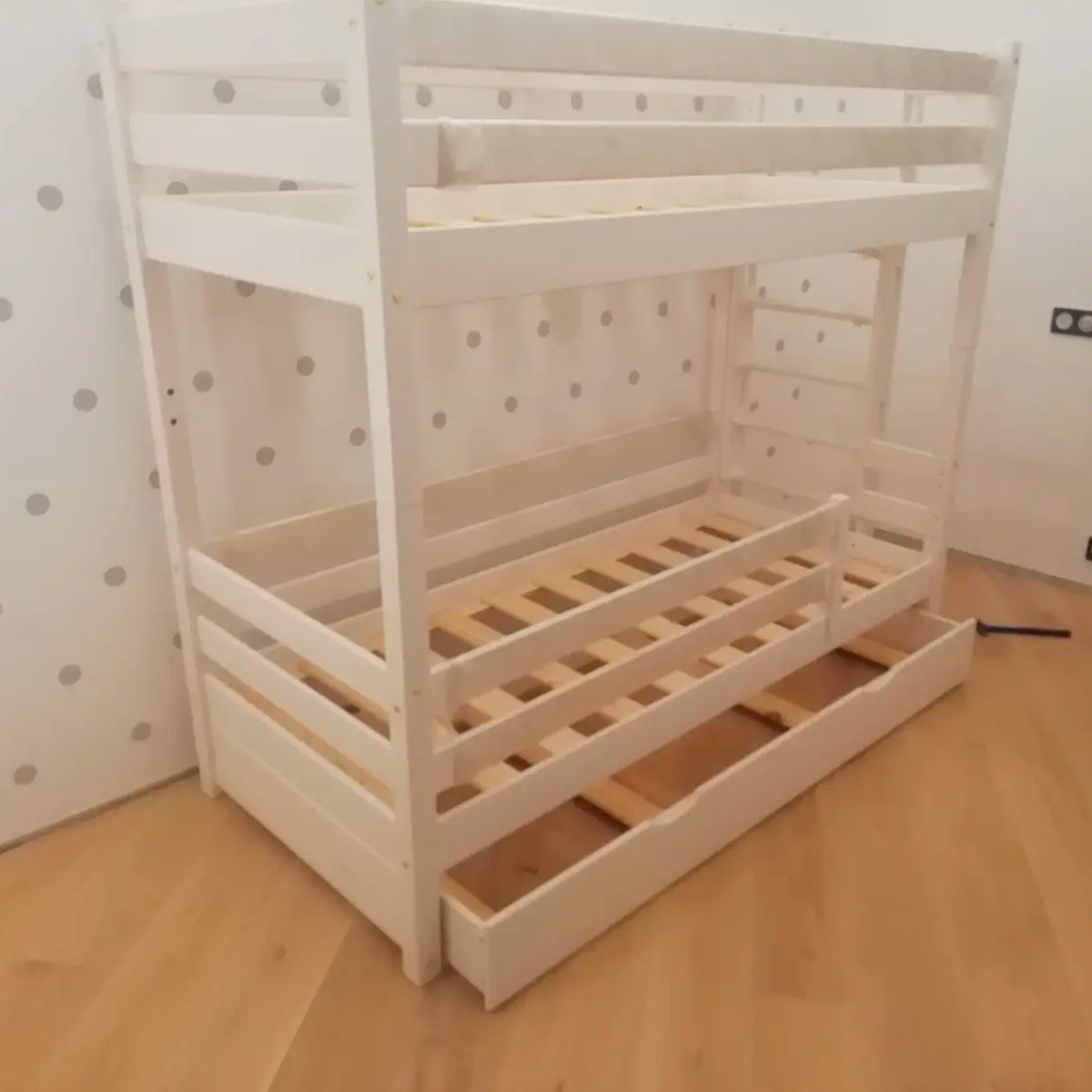 Обратите внимание, что все изделия выполнены из экологически безопасного материала – массива сосны – и покрыты нетоксичным лаком. Возможные цветовые решения указаны в карточке товара. В базовую комплектацию входят деревянный настил и бортики, а ящики и накидка на кровать заказываются отдельно.