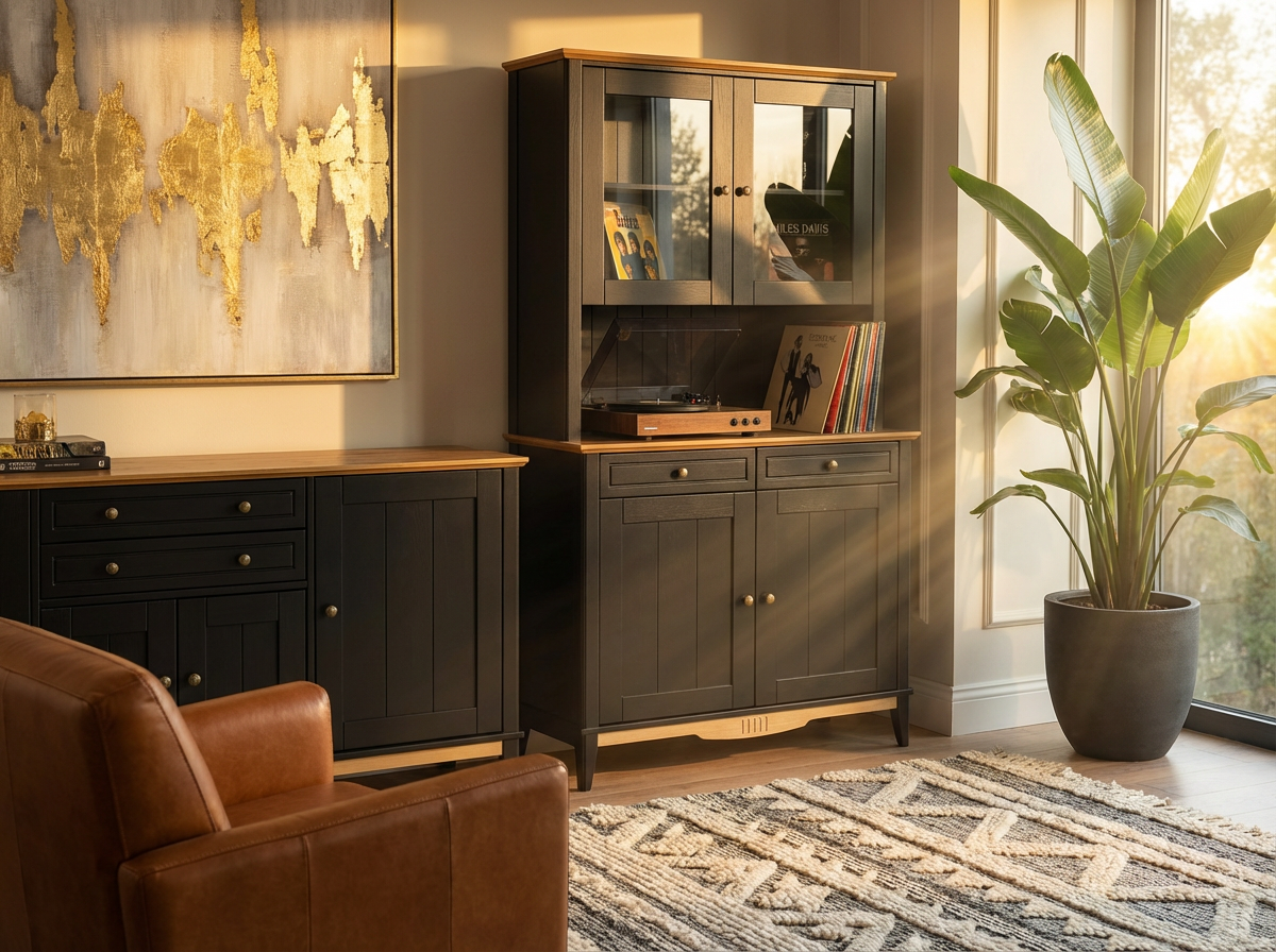 Буфет состоит из двух элементов: нижнего комода с двумя ящиками и двумя дверцами, а также верхней надстройки со стеклянными фасадами. Между ними образуется удобная открытая ниша — идеальное место для хранения или декоративной композиции.