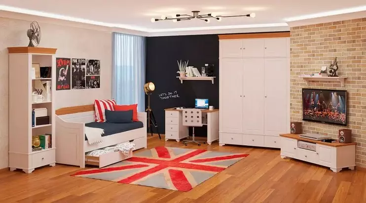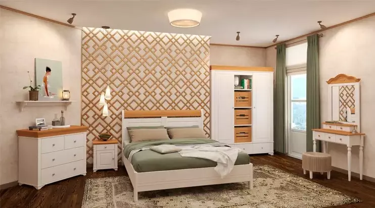 Мебель «Бейли» для спальни представлена односпальными и двуспальными кроватями, бельевыми шкафами, прикроватными тумбами, комодами, письменными столами, настенными полками и другими предметами, изготовленными из массива сосны. Изделия коллекции окрашиваются отличаются простыми формами, с минимальным декором, окрашиваются в мягкие успокаивающие тона.