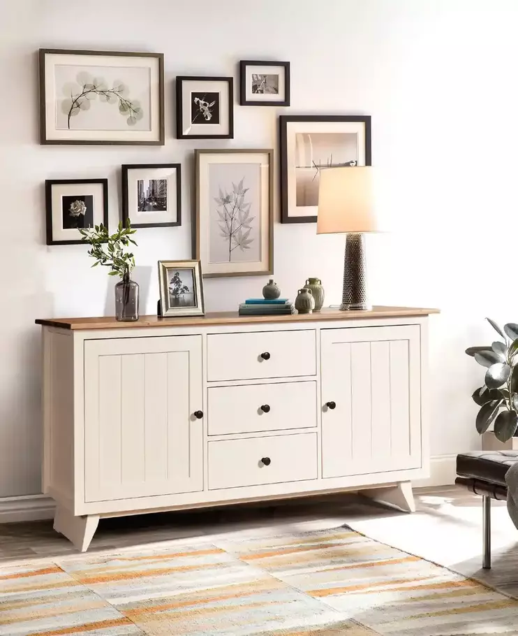 Предметы этой коллекции окрашиваются в два приятных светлых цвета, «слоновая кость» и «коньяк». На дверцах сделана вертикальная фрезеровка. В комплекте идут металлические ручки-кнопки черного цвета.
